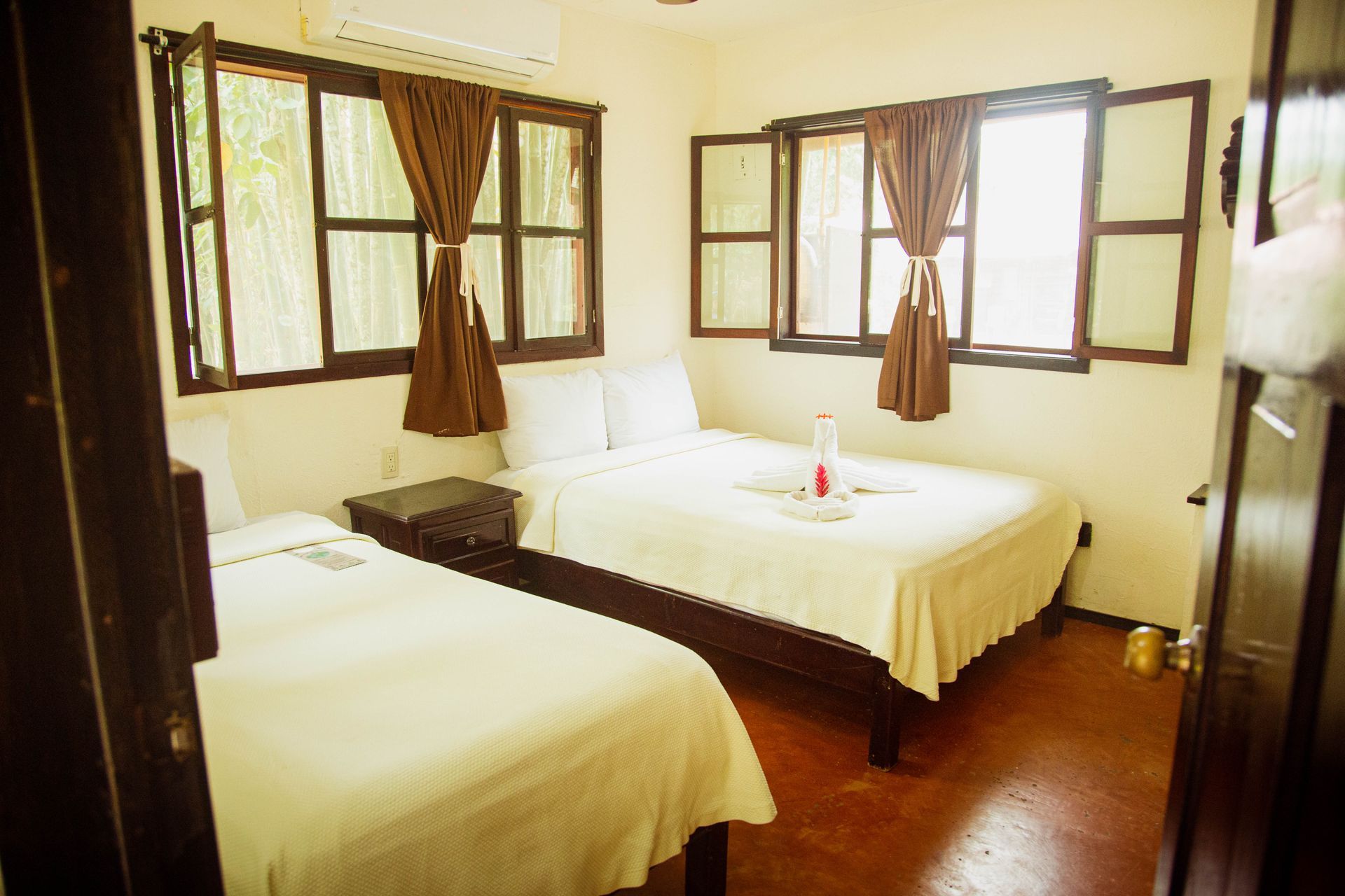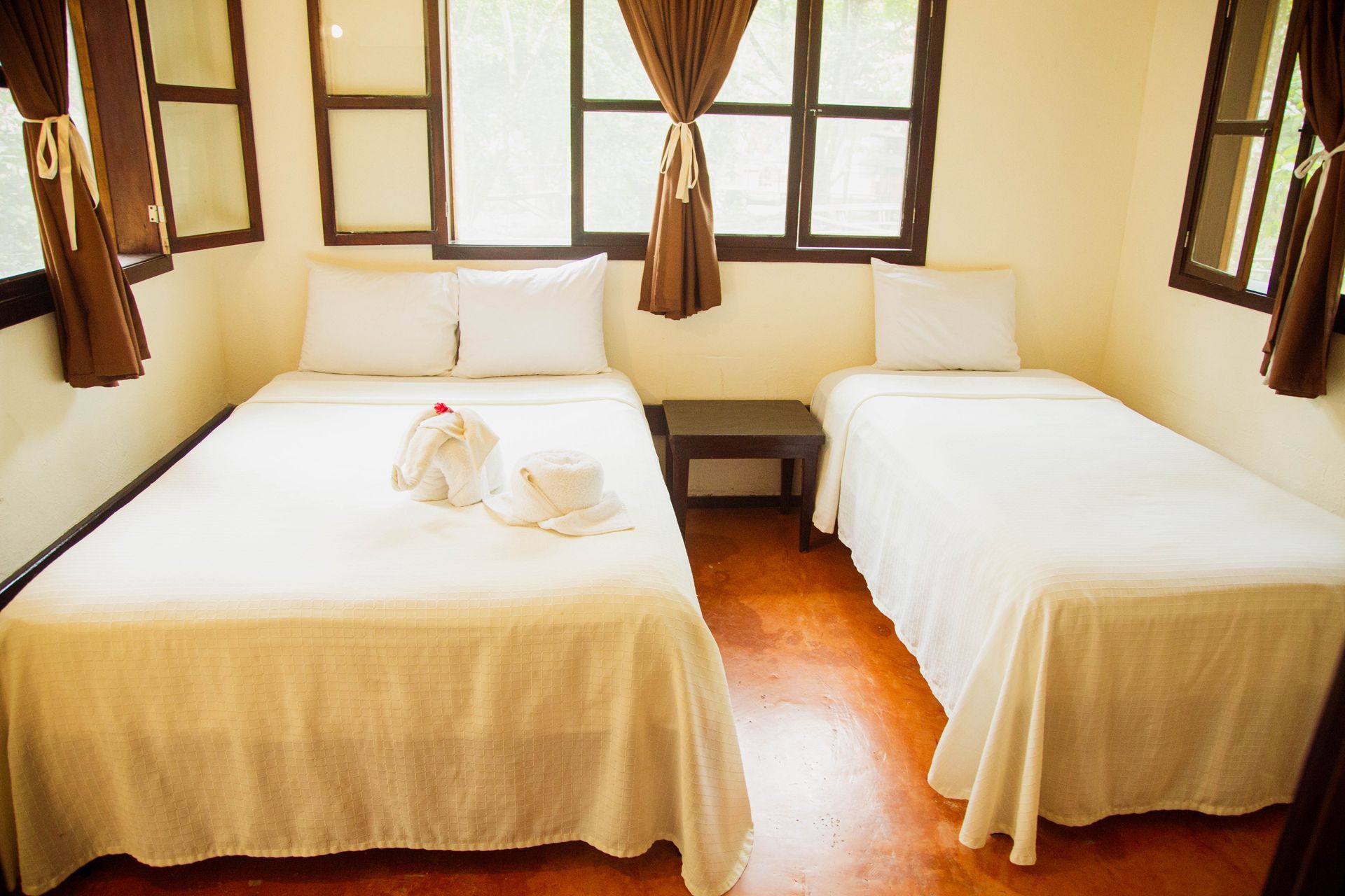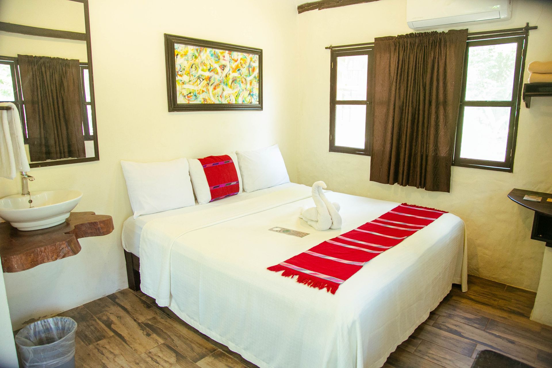 Detalles: Cabañas con una cama matrimonial y una individual baño privado, equipadas con ventilador, A/C minisplit, caja de seguridad, botella de agua, jabón y toalla.