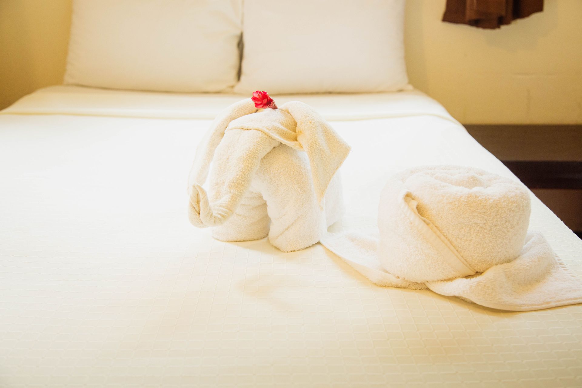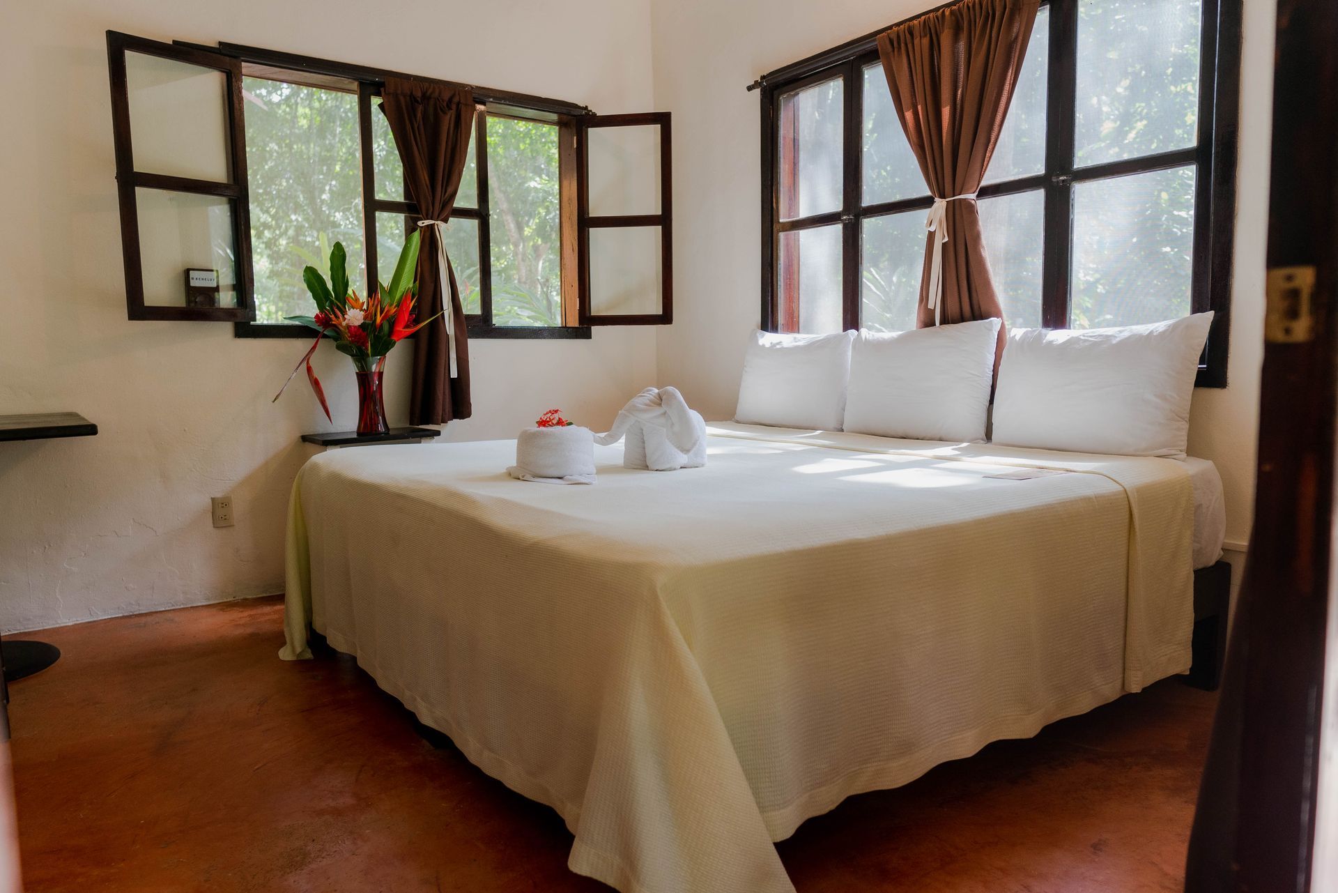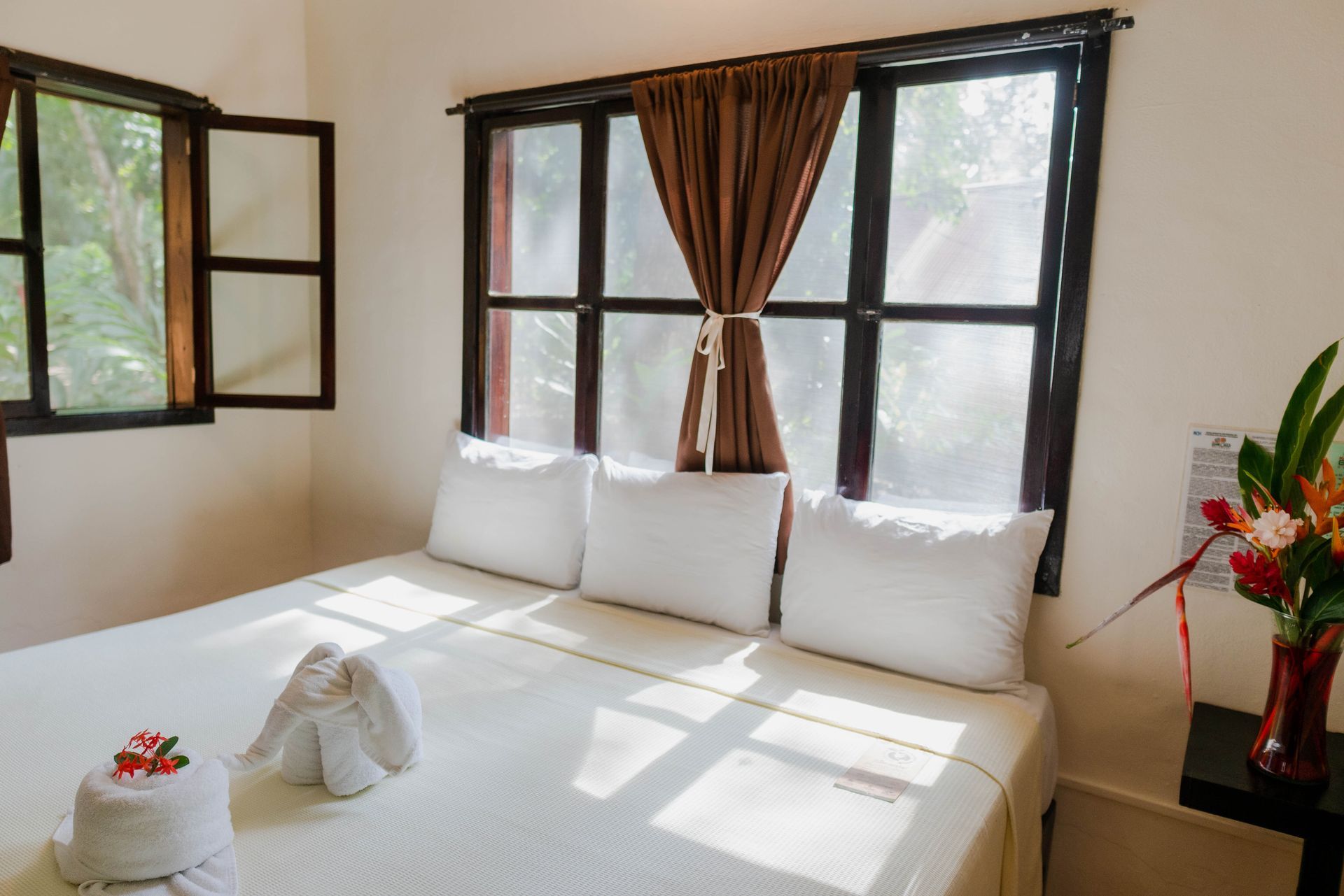 Detalles: Cabañas con una cama matrimonial y una individual baño privado, equipadas con ventilador, A/C minisplit, caja de seguridad, botella de agua, jabón y toalla.